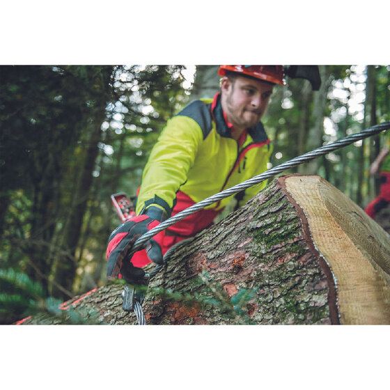 Ειδικά γάντια για εργασία με αλυσοπρίονο. Το πιστοποιημένο γάντι είναι μόνο το αριστερό σύμφωνα με το πρότυπο EN381-7. Το πίσω μέρος του γαντιού είναι κόκκινο για καλύτερη ορατότητα.